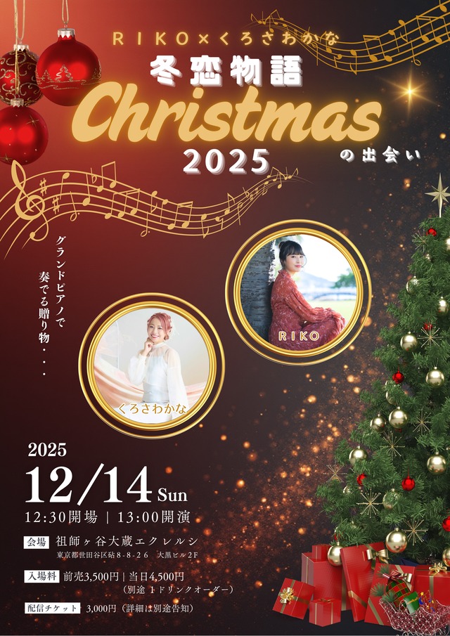 RIKO×くろさわかな 冬恋物語~クリスマスの出会い2025~ 2025.12.14 sun Open 12:30/Start 13:00 前売り3,500円+1D 当日4,500円+1D @祖師ヶ谷大蔵エクレルシ 東京都世田谷区砧8-8-26 大黒ビル2F ライブカフェエクレルシ (小田急線祖師ヶ谷大蔵駅より徒歩2分) ーーーーー 【注意事項】 ★チケットの郵送・発券等はございません。 当日受付にてお名前をお申し付けください。 ★自動返信メールをもちましてご予約完了となります。 (万が一届かない場合、直接予約アーティストへお問い合わせください) ★ご予約完了後は、キャンセル、返金は出来ませんので予めご了承下さい。